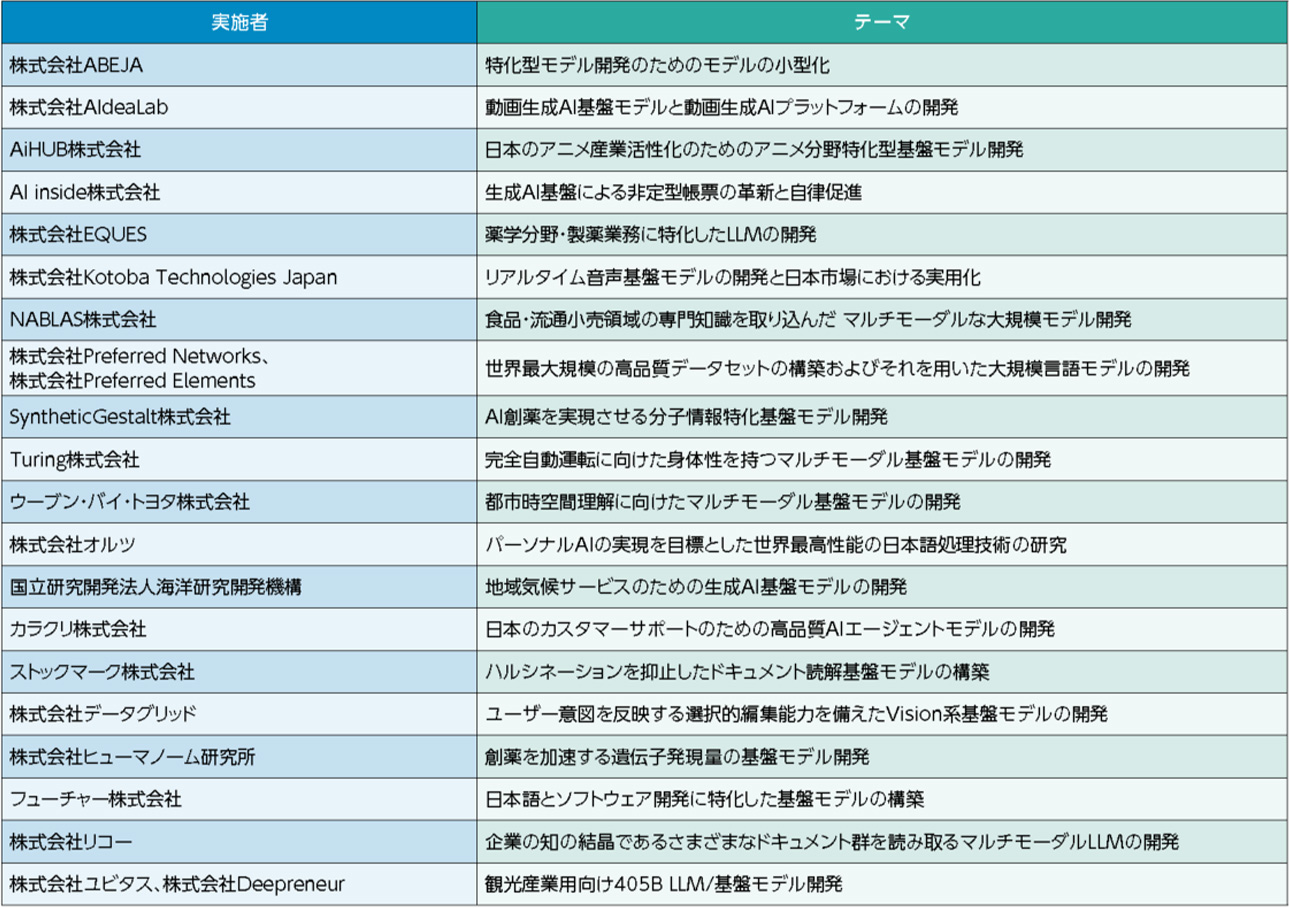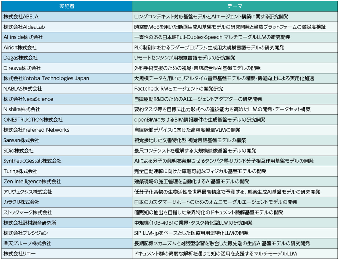 また、ビジネスにおけるデータ利活用では、生成AIによる図版やグラフ、テキストや画像といった半構造化・非構造化データの活用が今後の課題になっているが、この解決を図る取り組みも採択されている。リコーが取り組む、企業ドキュメントの効率的な読み取りを可能にする生成AI基盤開発がその一つだ。同社は、複合機開発を通して蓄積した独自の画像認識技術の活用を通し、さらなるデータ利活用というビジネスニーズに対応するマルチモーダル生成AI基盤開発に取り組んでいる。