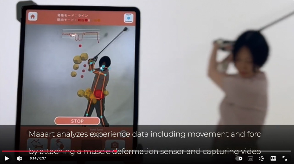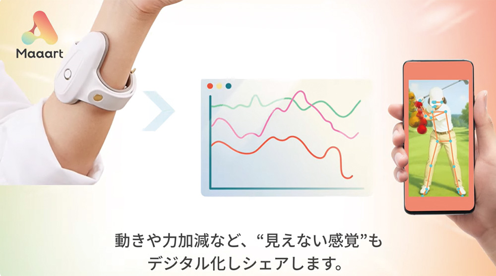 玉城氏:例えば、りんごを握ったときに感じる重さや手指の動き、力の入れ具合などの固有感覚は、体験の共有に不可欠な要素です。BodySharingは、力の入れ具合の可視化を通し、固有感覚の共有を可能にすることが大きな特長です。以前私たちは、あるメダリストの方の力の入れ具合の可視化に取り組んだことがあります。事前ヒアリングでお聞きした当人の筋肉の使い方は、バイオメカニクスでは説明のつけようがないようなものでした。しかし弊社の筋変位センサデバイスを装着いただき、力の入れ具合を可視化すると、ご本人の説明通りに筋肉が使われていました。これまでプレーを見て想像するしかなかった、トップアスリートの筋肉の使い方を共有できてしまうことがBodySharingの大きな特長です。
