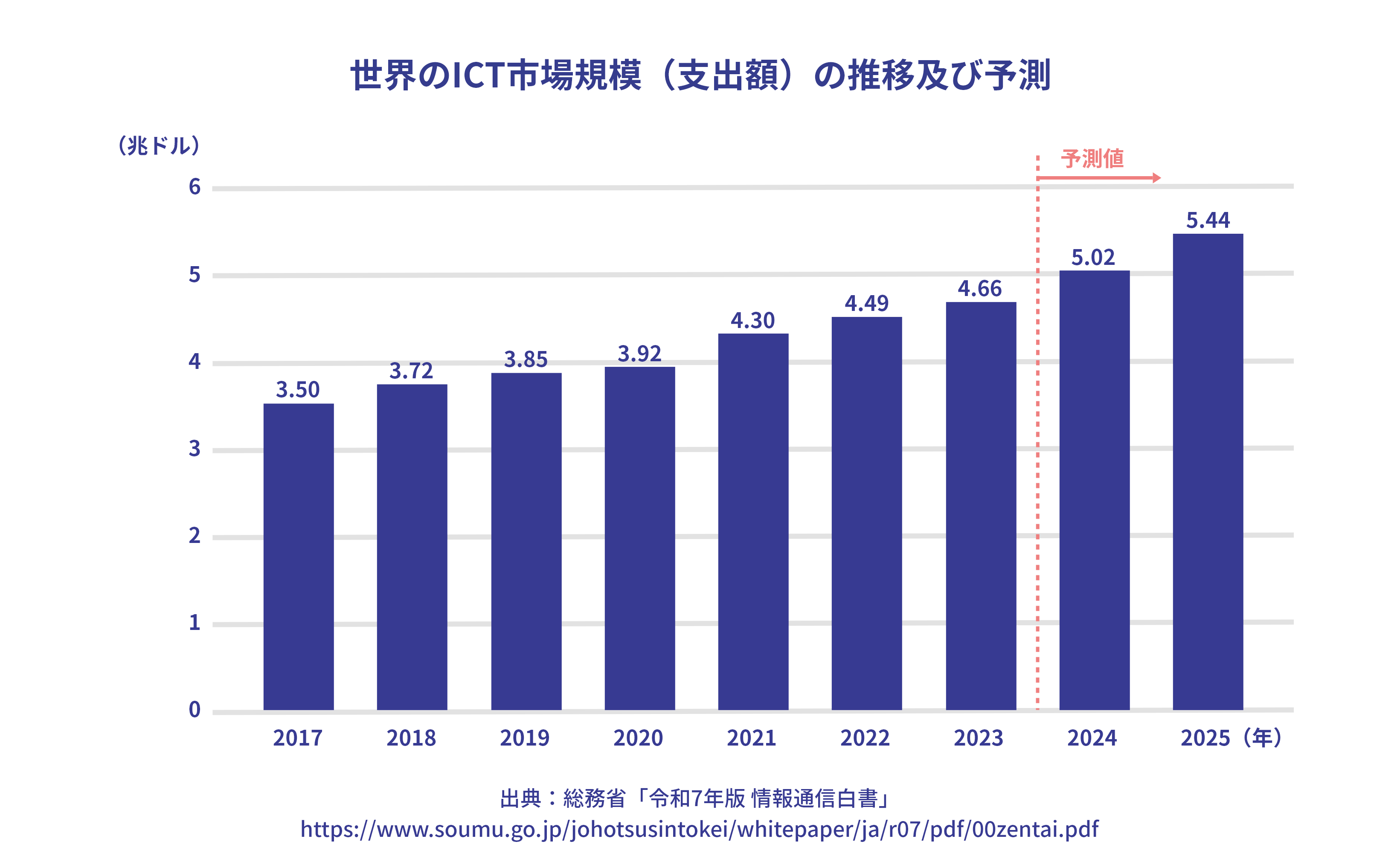 また、世界のICT市場規模(支出額)に目を向けると、近年は増加傾向で推移している。2024年には前年比7.7%増の5.02兆ドル、2025年には前年比8.3%増の5.44兆ドルへの増加が予測されている。