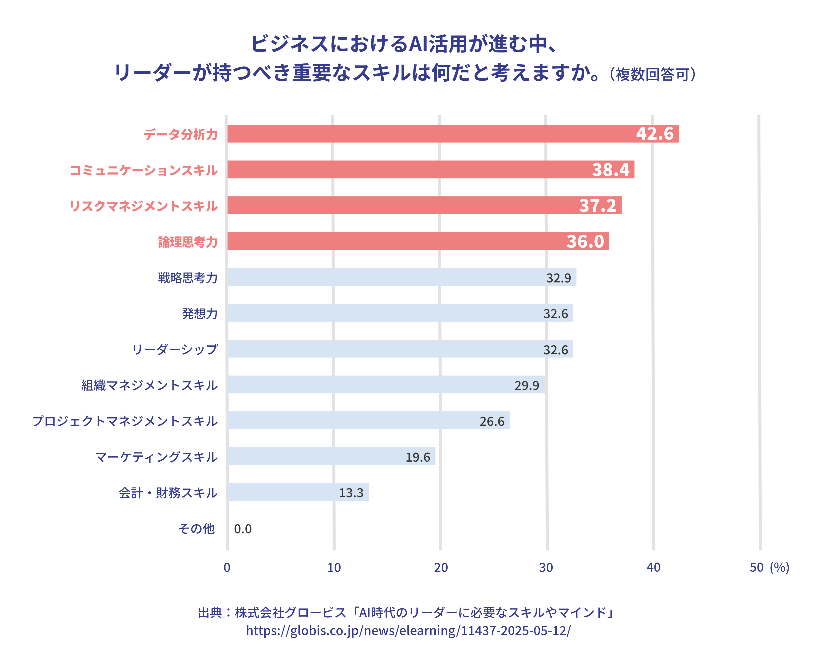 同調査では「ビジネスにおけるAI活用が進む中、リーダーが持つべき重要なスキルは何だと考えますか。(複数回答可)」という質問がなされた。回答結果は以下のとおり。