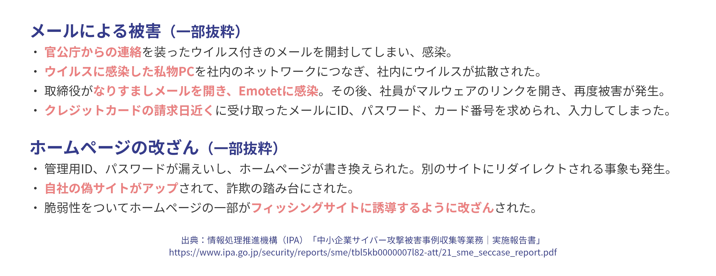 また、IPAが2025年7月に公開した「中小企業サイバー攻撃被害事例収集等業務 実施報告書」には、メールによる被害とホームページの改ざんという観点から実際のサイバー攻撃実例が紹介されている。