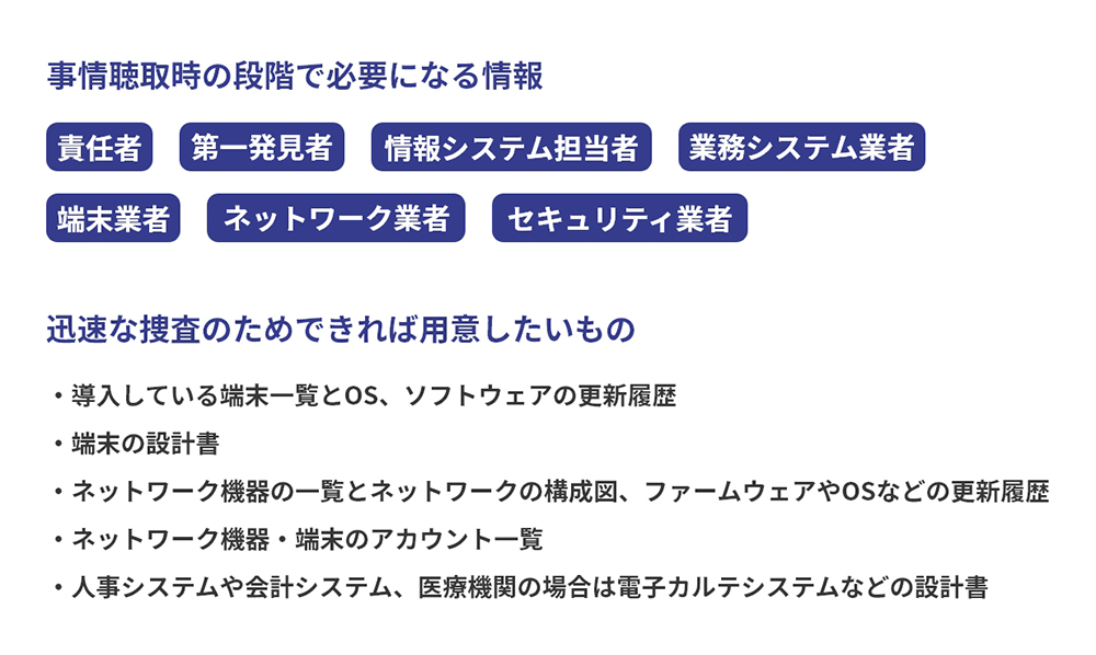 ここまで見てきたように、導入している端末やネットワークの状態が事前に記録されているかどうかが、その後の捜査の進捗に大きく関わる。また、窓口を定めておくことも大切だ。