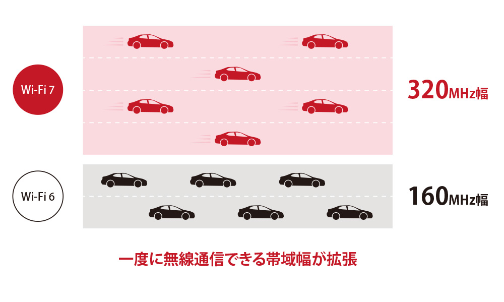 2024年1月に、Wi-Fi 6Eの後継となるWi-Fi 7(無線LAN規格の名称はIEEE 802.11be)の認証がスタートした。Wi-Fi 7は、Wi-Fi 6Eをベースに改良が行われ、最大通信速度や接続の安定性が向上している。通信速度については、Wi-Fi 6Eが最大9.6Gbps(理論値)だったのに対し、Wi-Fi 7では最大46Gbps(理論値)と、約4.8倍にも向上している。この大幅な速度向上を実現した秘密は、「320MHz帯域幅」「2倍のストリーム」「4096QAM」の採用にある。帯域幅は、Wi-Fi 6Eでは最大160MHzだったが、2倍の320MHzに拡張された。帯域幅は高速道路の車線数のようなもので、幅が広がればそれだけ速度も向上する。ストリーム(通信経路)も従来の8から16に倍増し、変調方式も1024QAMから4096QAMに進化したことで、それぞれ通信速度が2倍、1.2倍に向上しており、あわせて2×2×1.2=4.8倍の速度になる。