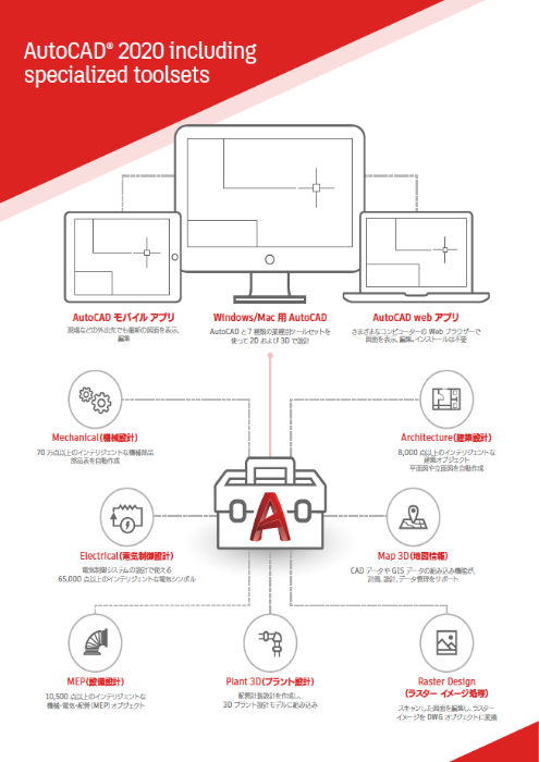 Autodesk® AutoCAD® は、正確な 2D 図面や 3D モデルを作成できるツールとして、建築設計やエンジニアリングをはじめとするさまざまな分野において利用されています。AutoCAD including specialized toolsets のサブスクリプションメンバーになると、業種専用の機能、柔軟なワークスタイルを実現する Web アプリとモバイル アプリ、サブスクリプションメンバー限定で提供される画期的な最新機能をご利用いただけます。建築設計、機械設計、3D マッピングなどの業種に特化したライブラリや機能の数々は、作業効率の向上に役立ちます。Web アプリとモバイル アプリを使えば、いつでも、どこでも、自由に設計や作図などの作業を行なえます。機能が強化され、パフォーマンスが向上した最新の AutoCAD で、スマートに作業をしませんか。